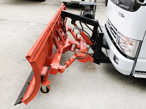除雪铲安装时,将除雪铲与汽车对正,操纵汽车前端的快速连接架与雪铲连接架对准,把雪铲的液压单元与汽车车载24v电源接通,将雪铲的连接架与汽车的快速连接架连接,并用销子将雪铲与快速连接架固定。雪铲安装后,调整雪铲左右偏转油缸,使雪铲铲面与车辆前进方向形成一定的夹角,以利于除雪时将雪抛向路边。